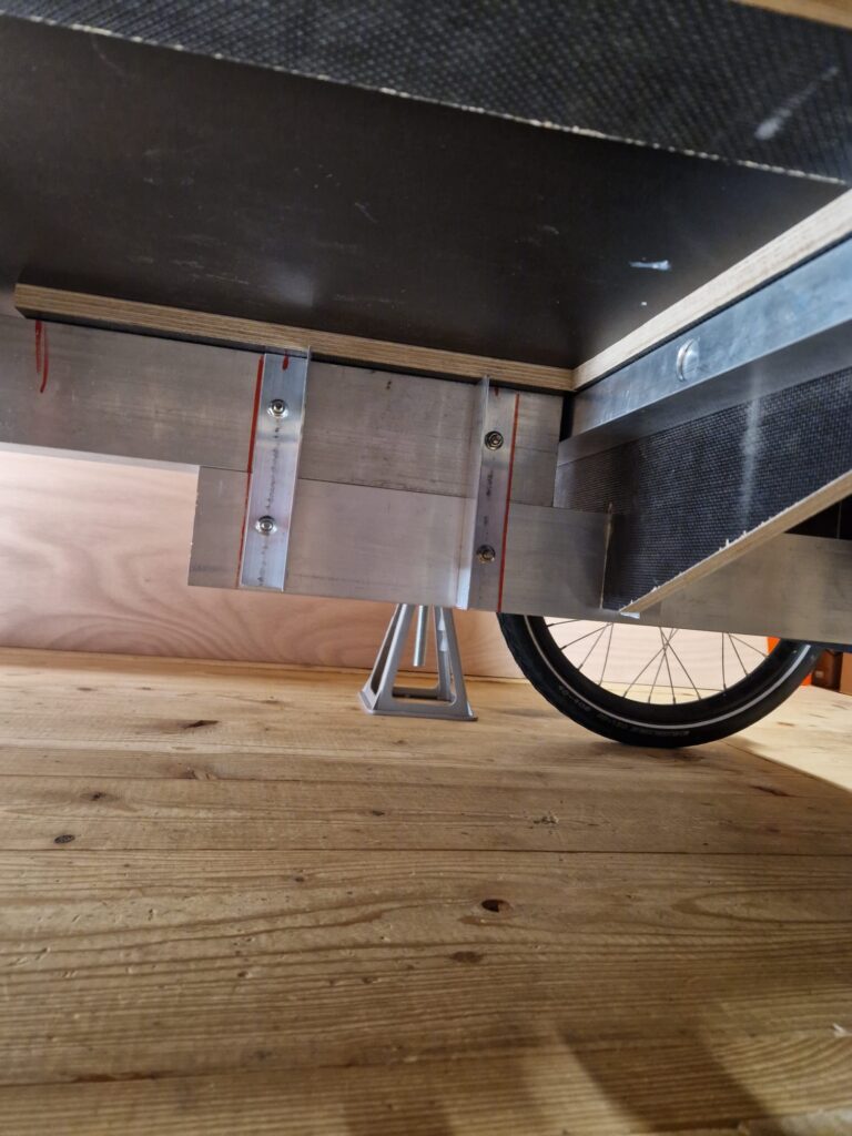 Die Lösung im Bezug auf die Stabilität sieht nun so aus: es wurden unter der Bodenplatte Alu-Rechteckrohre angeschraubt. In diese werden wiederum kleinere Alu-Rechteckrohre gesteckt, die nach außen überstehen. Unter die „Überstände“ stellt man Alu-Stützen mit Gewinde, so dass die Höhe angepasst werden kann.