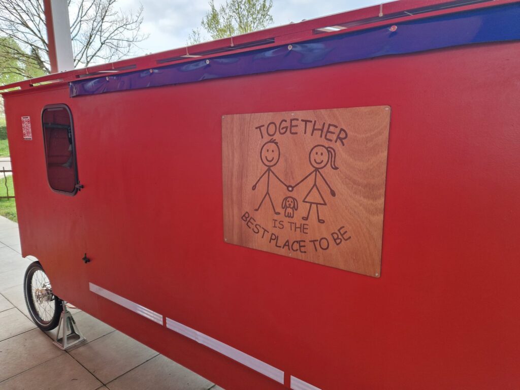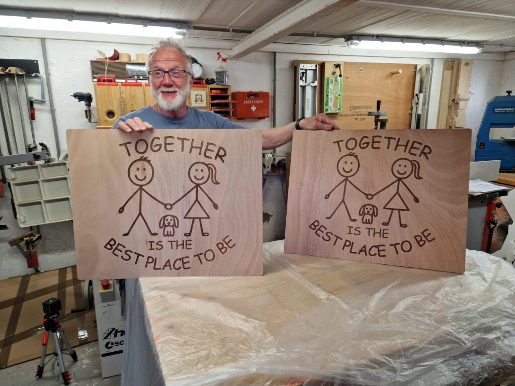 Das zweite „i-Tüpfelchen“ hat uns Karl-Heinz beschert. Er hat uns nämlich zwei wunderschöne Schilder mit unserem „Lebensmotto“ hergestellt, die wir jetzt stolz auf unserem Wohnwagen für alle sichtbar durch die Gegend fahren. Ich hatte unser „Logo“ vor einigen Monaten einfach auf ein Zettelchen gekritzelt. Karin (Karl-Heinz‘ Frau) musste es in mühevoller Arbeit in eine für den Laser brauchbare Datei umwandeln . Danach konnte Karl-Heinz es mit seinem Laser fertigen.